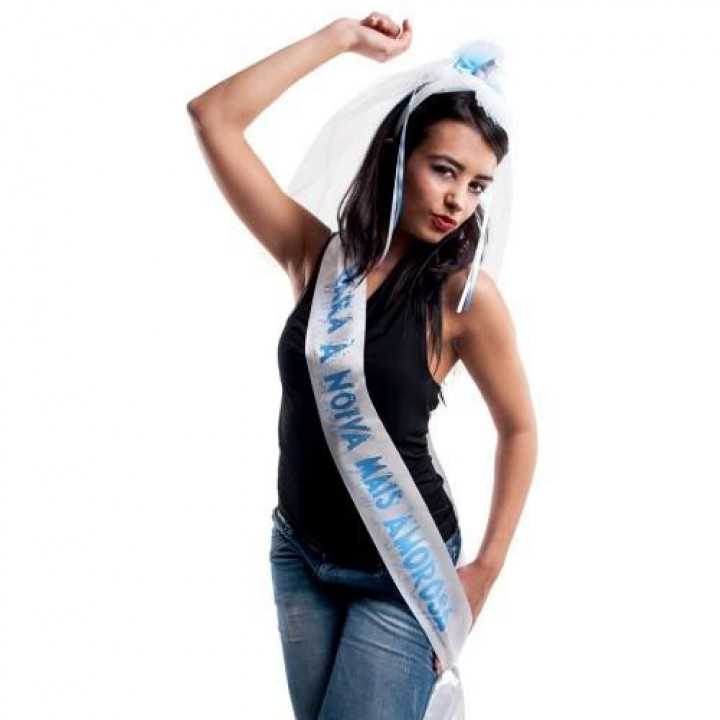 Despedida Solteiro / aUma fantástica faixa ideal para usar na sua despedida de solteira. A faixa tem escrito “PARA A NOIVA MAIS AMOROSA” em português e junto tem também véu em tule branco com um pequeno pénis no topo.