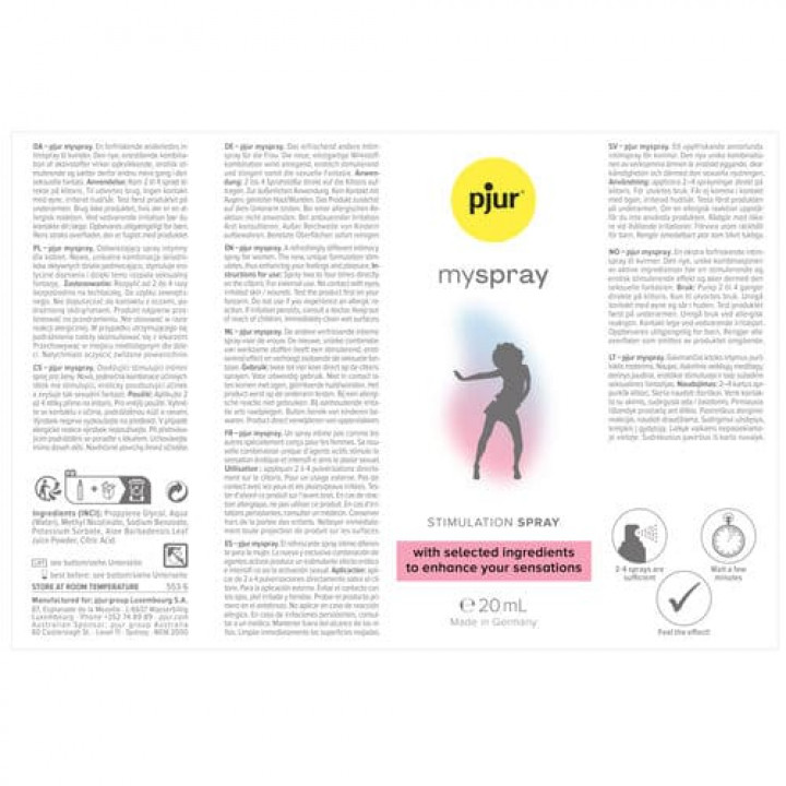 A nova e exclusiva combinação de agentes ativos de Pjur Myspray produz um efeito erótico estimulante e assim intensifica a ativação sexual.